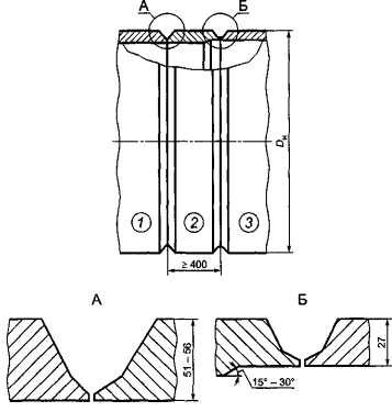 6.1.3.18 Поры и включения с расстояниями между ними не более трех максимальных ширин или диаметров не допускаются. 6.1.3.19 Все сварные швы фильтров подлежат маркировке (клеймению). Клеймо следует наносить в соответствии с правилами ПБ 03-584 [2]. 6.1.3.20 У продольных швов клеймо должно быть расположено в начале и конце шва на расстоянии 100 мм от кольцевого шва. На обечайке с продольным швом длиной менее 400 мм допускается ставить одно клеймо. Для кольцевого шва клеймо выбивают в месте пересечения кольцевого шва с продольным и далее через каждые 2 м, но при этом должно быть не менее двух клейм на каждом шве. На кольцевой шов фильтра диаметром не более 700 мм допускается ставить одно клеймо. Место клеймения заключается в хорошо видимую рамку, выполняемую несмываемой, отличительной краской. 6.1.3.21 Вместо клеймения сварных швов допускается прилагать к паспорту фильтра схему расположения швов с указанием и подписью исполнителей. 6.1.3.22 Отверстия под патрубки и штуцера должны быть расположены вне сварных швов. Расстояние между краем шва приварки внутренних и внешних устройств и деталей и краем ближайшего шва корпуса должно быть не менее толщины наиболее толстой стенки, но не менее 20 мм. 6.1.3.23 Допускается пересечение стыковых швов корпуса угловыми швами приварки внутренних и внешних устройств (опорных элементов и т.п.) при условии контроля всего перекрываемого участка шва корпуса и прилегающих к нему участков шириной не менее 50 мм радиографическим и ультразвуковым методом. 6.1.3.24 Корпус должен быть изготовлен из обечаек. Обечайки следует изготовлять не более чем с двумя продольными швами, из листов максимально возможной длины. Вставки допускаются шириной не менее 400 мм. Ширина листа обечайки между кольцевыми швами должна быть не менее 800 мм, ширина замыкающей вставки - не менее 400 мм. 6.1.3.25 Продольные швы смежных обечаек и швы переходов должны быть смещены относительно друг друга на значение трехкратной толщины наиболее толстого элемента, но не менее чем на 100 мм между осями швов. 6.1.3.26 Патрубки входа и выхода нефти, предназначенные для сварного соединения с трубопроводами, должны быть длиной не менее 400 мм. Патрубки для присоединения трубопроводов дренажных линий должны быть длиной не менее 150 мм. 6.1.3.27 После сборки и сварки обечаек корпус фильтра должен удовлетворять следующим требованиям: - отклонение по длине - не более ±0,3% номинальной длины; - отклонение от прямолинейности - не более 1,5 мм на длине 1 м, а общее отклонение - не более 0,2% длины фильтра; - отклонение внутреннего (наружного) диаметра корпуса допускается не более ±1%. 6.1.3.28 Концевые участки патрубков фильтра, предназначенные для сварного соединения с трубопроводами, должны удовлетворять следующим требованиям: - отклонение профиля наружной поверхности от окружности в зоне сварного соединения на концевых участках длиной 200 мм от торцов и по дуге периметра 200 мм не должно превышать 0,15% номинального диаметра; - отклонение от перпендикулярности торца относительно образующей (косина реза) не должно превышать 1,6 мм; - предельное отклонение от номинального наружного диаметра на концах под сварное соединение на длине не менее 200 мм от торца не должно превышать ±1,6 мм; - допуск на овальность (разности наибольшего и наименьшего диаметров) не должен превышать ±3,0 мм; - допуск на овальность (отношение разност