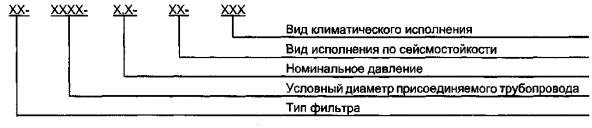 6.3.2 Фильтр может быть блочного и неблочного исполнения. Фильтр блочного исполнения по согласованию с заказчиком (потребителем) дополнительно включает в себя лоток, тяговый механизм с тросовой системой для извлечения фильтрующего элемента, комплект площадок для обслуживания, поддон. 6.3.3 Предприятие-изготовитель должно направлять вместе с изделием следующую эксплуатационную и конструкторскую документацию: - сборочный чертеж; - спецификацию; - расчет на прочность (включая проверку на сейсмостойкость и ветровую нагрузку); - руководство по эксплуатации; - инструкцию по монтажу, пуску, регулированию и обкатке; - паспорт фильтра с учетом требований настоящего стандарта (включая карту клейм сварных швов и карту измерения толщин стенок фильтра), правила ПБ 03-584 [2], ПБ 03-576 [1]; - ведомость комплекта запасных частей, инструмента и принадлежностей; - эксплуатационную документацию на комплектующие изделия в объеме поставки предприятия-изготовителя (фильтрующие элементы, манометры и т.д.); - свидетельство о консервации; - акт проведения гидравлического испытания фильтра на прочность и герметичность; - акт о проведении контрольной сборки или контрольной проверки размеров; - упаковочный лист и комплектовочную ведомость с полным перечнем упаковочных единиц. 6.4 Маркировка6.4.1 Структура обозначения фильтра в обязательном порядке должна состоять из групп следующих знаков, разделенных дефисом.