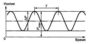 Испытание на усталость при осевой нагрузке заключается в приложении к образцу осевого растягивающего усилия. Нагрузка изменяется циклически по синусоидальному закону с заданной частотой и заданным размахом усилий (рисунок Б.1). Испытание проводят до достижения заданного числа циклов.