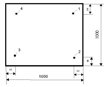 Рис. 1 Схема деформатора Деформатор представляет собой рычажную систему, упирающуюся в потолок помещения и пол. Один конец рычага (6) шарнирно соединен с осью (11), передающую давление через стойки (13 и 21) в потолок помещения, а на другой конец подвешивают груз (10). Острым ребром призмы (5) рычаг упирается во впадину оголовника (3), который через опорный стержень (2) и штамп (1) передает давление на испытываемую конструкцию. Прибор снабжен квадратным и роликовым сменными штампами, соответствующими по форме и размерам опорам ножек мебели, передающими нагрузку на полы жилых и общественных зданий. Ось, острие призмы и крюк (9) для подвески груза расположены на одной прямой, благодаря чему соотношение длин плеч рычага и давление на конструкцию сохраняются неизменными независимо от угла наклона рычага. Под давлением прибора конструкция пола проседает, угол наклона рычага уменьшается, ось перемещается в прорези (12), обеспечивая этим вертикальное опускание оголовника и опорного стержня со штампом. Одновременно происходит опускание измерительного стержня (14), нижний конец которого скреплен с оголовником, а верхний выведен на уровень глаз наблюдателя для измерения величины просадки конструкций под нагрузкой. Гири массой 6 и 18 кг. Прибор для измерения относительной влажности воздуха с точностью ±5% Термометр для измерения температуры воздуха с точностью ±2 °С. Линейка измерительная металлическая по ГОСТ 427-75. 5. ПОДГОТОВКА К ИСПЫТАНИЮ5.1 Испытания проводят на опытных участках, устраиваемых по бетонному подстилающему слою из бетона класса по прочности на сжатие В25 (ГОСТ 26633-91) толщиной не менее 80 мм, выполненному по грунтовому основанию. Опытный участок пола должен включать тепло-звукоизолирующий слой, стяжку, клеевую прослойку и покрытие пола с соблюдением толщины и материалов слоев регламентируемых соответствующими нормативными документами. Допускается проводить испытания реальных полов, например, при приемке их в эксплуатацию и при периодических испытаниях. 5.2 Размер опытного участка должен быть не менее 1000 × 1000 мм. 5.3 Материалы, из которых выполняется опытный участок пола, а также условия подготовки и обработки поверхности нижележащего элемента перед укладкой последующего, условия твердения элементов должны удовлетворять требованиям соответствующих нормативных документов. Испытания проводят после достижения материалами покрытия прочности в проектном возрасте, регламентируемом соответствующими нормативными документами. 5.4 Во время испытания покрытие пола должно быть сухим. Перед испытанием следует проверить отсутствие отслоений при помощи простукивания верхних элементов опытного участка пола. 6. КОНДИЦИОНИРОВАНИЕПеред испытаниями и в процессе его проведения в помещении с выполненным опытным участком пола в течение не менее 48 часов должны поддерживаться температура воздуха в пределах от +18 до +24 °С и относительная влажность воздуха в пределах от 30 до 45%. 7. ПРОВЕДЕНИЕ ИСПЫТАНИЙ7.1 На опытном участке пола намечает четыре точки, расположенных в соответствии с рекомендациями, приведенными на рис. 2. При испытании реального пола в помещении намечаются четыре точки, расположенные на расстоянии 50 мм от стены и не менее 500 мм друг от друга.