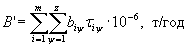 где i - индекс ввда загрязняющего вещества (присваивается произвольно i = 1, 2, 3..., m); ψ - номер источника выброса соответствующего загрязняющего вещества (присваивается произвольно ψ =1, 2, 3..., z); biψ - маccа i-гo загрязняющего вещества, выбрасываемого ψ-м источником выброса, г/с τiψ - продолжительность выброса i-го вещества ψ-м источником выброса, с/год Иными словами, валовой выброс загрязняющего вещества в атмосферу является частью валового выделения этого вещества , поступающей в атмосферу. Для источника, снабженного установкой очистки, величина валового выброса (b) определяется как разность количеств отходящего (g) и уловленного (y) загрязняющего вещества: b = g-y (5.3) При отсутствии установки очистки величина валового выброса равна количеству отходящего загрязняющего вещества или валовому выделению, т.е. b = g и принимается для организованных источников по табл. 4.3 Значения степени очистки η принимаются по данным раздела 6. 5.2. Расчет по удельным показателям Данный метод допускается применять для оценочных и ориентировочных плановых расчетов (проектные работы, учет выбросов при перспективе расширения предприятия и т.п.), когда метод расчета по источникам выделения по ряду причин применять нельзя. По рассматриваемому в настоящем подразделе методу валовой выброс определяется для производства (предприятия) в целом. При этом валовой выброс определяется по формуле: