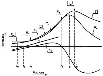 Значение импеданса эквивалентной электрической схемы (|Z|), его активная составляющая Re, его реактивная составляющая Хе и реактивное сопротивление Х1 ветви L1, C1, R1 нанесены на рисунке 2 в виде зависимости от частоты для определения разных характерных частот. |Zm| и |Zn| обозначают минимальный и максимальный импеданс соответственно и Rr, Ra при нулевом фазовом угле. Эти кривые, однако, имеют только качественный характер и не представляют конкретный пьезоэлектрический резонатор.