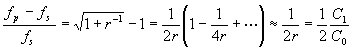 Для получения практических уравнений для обычного использования необходимо сделать предположения. Погрешность этих предположений в сумме с инструментальной погрешностью управляет общей погрешностью определенных экспериментально параметров. В качестве первого приближения, достаточного для многих практических случаев, можно сделать следующие предположения fm = fr = fs и fa = fn = fp. Более точные соотношения между характерными частотами fm, fr, fa, fp, fn и частотой последовательного fs резонанса резонатора, действительные для добротности М > 10 и коэффициента емкости r > 10, приведены в таблице 4. Эти соотношения получены при предположении, что М >> 1. Различие между частотами параллельного и последовательного резонансов определяют по уравнению Для больших значений r можно использовать приближение, выраженное формулой (например, при r > 25 ошибка составляет менее 1 %). 2.2.19 резонансная частота (resonance frequency) fr: Нижняя из двух частот кварцевого резонатора без нагрузки в установленных условиях, при которой электрический импеданс кварцевого резонатора является резистивным. 2.2.20 резонансное сопротивление (resonance resistance) Rr: Сопротивление кварцевого резонатора без нагрузки на резонансной частоте fr. 2.2.21 антирезонансная частота (anti-resonance frequency) fa: Высшая из двух частот кварцевого резонатора в установленных условиях, при которой электрический импеданс кварцевого резонатора является резистивным. 2.2.22 нагрузочная емкость (load capacitance) CL: Эффективная внешняя емкость, присоединяемая к кварцевому резонатору, определяющая резонансную частоту fL под нагрузкой. 2.2.23 резонансная частота под нагрузкой (load resonance frequency) fL: Одна из двух частот кварцевого резонатора, соединенного последовательно или параллельно с нагрузочной емкостью, в установленных условиях, при которых импеданс этого соединения является резистивным. Резонансная частота под нагрузкой является нижней из двух частот, если нагрузочная емкость включена параллельно (см. рисунок 4). При известном значении нагрузочной емкости С1 эти частоты идентичны для всех практических целей и вычисляются по формуле Примечание 1 - Частоты, определения которых приведены в 2.2.19, 2.2.21 и 2.2.23, являются наиболее используемыми. Имеется большое количество других частот, которые могут быть у кварцевого резонатора, их полные определения можно найти в таблицах 2 и 4. Примечание 2 - Если требуется более высокая точность или необходимо получить дополнительные данные (например, значения динамических параметров кварцевого резонатора), следует руководствоваться таблицей 1 настоящего стандарта, МЭК 60444-1 и МЭК 60444-5. 2.2.24 резонансное сопротивление под нагрузкой (load resonance resistance) RL: Сопротивление кварцевого резонатора с последовательной установленной внешней емкостью на резонансной частоте fL. Примечание - В более точном приближении значение RL связано со значением Rr, вычисленным по формуле