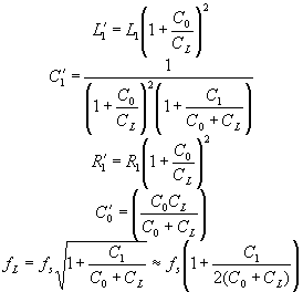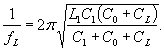 2.2.25 номинальная частота (nominal frequency) fnom: Частота кварцевого резонатора, установленная изготовителем. 2.2.26 рабочая частота (working frequency) fw: Рабочая частота кварцевого резонатора в конкретных схемах. 2.2.27 сдвиг резонансной частоты под нагрузкой (load resonance frequency offset) DfL: DfL = fL – fr. (6) Его можно приближенно вычислять по формуле