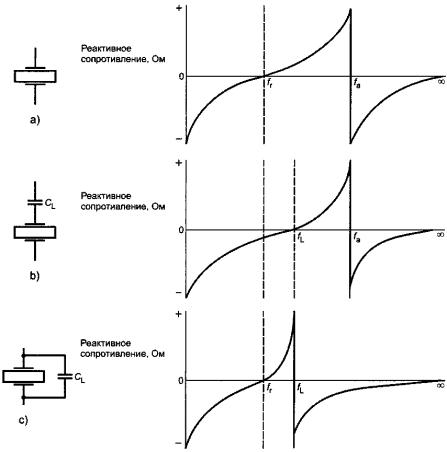 Примечание 1 - Значения нагрузочных емкостей, изображенных на рисунках а), b) и с) равны. Примечание 2 - См. 2.2.19, 2.2.21 и 2.2.23. Рисунок 4 - Резонансная, антирезонансная частоты и резонансная частота под нагрузкой 2.2.28 относительный сдвиг резонансной частоты под нагрузкой (fractional load resonance frequency offset) DL: