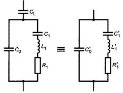 Рисунок 5 - Эквивалентная схема пьезоэлектрического резонатора с последовательной (нагрузочной) емкостью CL 2.3 Предпочтительные параметры и характеристикиПредпочтительные параметры и характеристики по 2.3.1-2.3.11. 2.3.1 Интервалы температур для работы в окружающей среде Интервалы температур для работы в окружающей среде выбирают из следующего ряда: от минус 55 °С до плюс 125 °С; от минус 55 °С до плюс 105 °С; от минус 55 °С до плюс 100 °С; от минус 55 °С до плюс 90 °С; от минус 40 °С до плюс 90 °С; от минус 40 °С до плюс 85 °С; от минус 40 °С до плюс 80 °С; от минус 40 °С до плюс 70 °С; от минус 30 °С до плюс 80 °С; от минус 30 °С до плюс 70 °С; от минус 25 °С до плюс 80 °С; от минус 20 °С до плюс 85 °С; от минус 20 °С до плюс 80 °С; от минус 20 °С до плюс 70 °С; от минус 20 °С до плюс 60 °С; от минус 10 °С до плюс 70 °С; от минус 10 °С до плюс 60 °С; от минус 10 °С до плюс 50 °С; от 0 °С до 60 °С; от 0 °С до 50 °С; от 5 °С до 55 °С; от 10 °С до 40 °С; от 15 °С до 50 °С. 2.3.2 Интервалы повышенных температур для термостатирования Интервалы повышенных температур для термостатирования выбирают из следующего ряда: (60 ± 5) °С; (65 ± 5) °С; (70 ± 5) °С; (75 ± 5) °С; (80 ± 5) °С; (85 ± 5) °С. 2.3.3 Допуск по частоте (1´10-6) Допуск по частоте выбирают из следующего ряда: ± 200; ± 100; ± 50; ± 40; ± 30; ± 25; ± 20; ± 15; ± 10; ± 7,5; ± 5; ± 4; ± 2,5; ± 1. 2.3.4 Условия работы в схеме Нагрузочная емкость - 10; 15; 20; 30; 50 пФ; последовательный резонанс. 2.3.5 Уровни возбуждения Уровни возбуждения резонаторов среза AT с колебаниями сдвига по толщине: - ток 150, 200, 1000, 2000 мкА; - мощность 1, 10, 100, 500 мкВт. Уровни возбуждения резонаторов с колебаниями изгиба и сдвига по контуру: - ток 100, 200 мкА. Уровни возбуждения резонаторов с продольными колебаниями: - ток 500, 1000 мкА. 2.3.6 Зависимость от уровня возбуждения