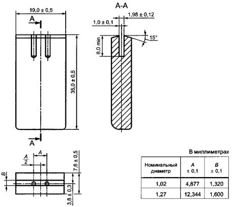 Рисунок 6 - Инструмент для испытания выводов на изгиб Примечание - Чтобы осуществлять изгиб главным образом в месте проточки, на штырьки надевают пластину с двумя отверстиями. Эта пластина должна быть такой толщины, чтобы в нее входила часть проточки на штырьках. Штырьки следует изгибать с помощью инструмента на угол 15° ± 2° в одном направлении, а затем на угол 30° ± 2° в противоположном направлении и после этого отогнуть их на угол 15° ± 2°, возвращая в первоначальное положение. Скорость изгибания должна быть примерно 2° в секунду в каждом направлении. При использовании этого испытания концы штырьков не должны обламываться. 4.8.2 Герметичность (неразрушающее испытание) а) Проверка отсутствия больших течей Это испытание следует проводить в соответствии с методикой, приведенной в методах 1 и 2 испытания Qc МЭК 60068-2-17. Метод 1 Жидкостью должна быть дегазированная вода, давление воздуха над водой следует понижать не более чем до 8,5 кПа (85 мбар) и не требуется спускать воду или удалять образец из воды перед прерыванием вакуума. Метод 2 Следует поддерживать температуру жидкости (125 ± 5) °С. Если иное не оговорено в ТУ на резонаторы конкретных типов, время погружения должно быть 30 с. Через 1 мин резонатор вынимают из камеры и подвергают воздействию контролируемых условий восстановления по МЭК 60068-1, пункт 5.4.1. Во время испытания не должно наблюдаться утечки газа или воздуха из кварцевого резонатора. Непрерывное образование пузырьков свидетельствует о наличии утечки. b) Проверка отсутствия малых течей Это испытание следует проводить в соответствии с методом 1 испытания Qk МЭК 60068-2-17. Если в ТУ на резонаторы конкретных типов не оговорено иное, давление в резервуаре должно быть 200 кПа (2 бара). Если в ТУ на резонаторы конкретных типов не оговорено иное, максимальная скорость утечки не должна превышать значение, установленное в 2.3.11. c) Проверка вакуума кварцевых резонаторов (только резонаторов в стеклянных баллонах) Вакуум необходимо проверять под действием максимального напряжения, не превышающего 15 кВ, подаваемого от катушки Тесла. Во избежание повреждения кварцевого резонатора точка приложения испытательного электрода должна быть максимально удалена от кварцевого пьезоэлемента и выводов. Для облегчения наблюдения результирующего разряда испытание следует проводить в полутемноте. Внутри корпуса не должно быть дугового искрения. Там, где происходит однородный разряд, он должен быть бледно-голубого цвета. Примечание - Это испытание следует выполнять за максимально короткое время, поскольку оно может вызывать изменение номинальной частоты испытуемого кварцевого резонатора. 4.8.3 Пайка (паяемость и теплостойкость при пайке) (разрушающее испытание) a) Паяемость Это испытание выполняют в соответствии с методом 1 испытания Та МЭК 60068-2-20. Для предотвращения нагревания компонента прямым излучением от паяльной ванны используют экран из теплоизолирующего материала. Он должен давать возможность погружать выводы до точки, отстоящей на 2 мм от выхода выводов из корпуса, если в ТУ на резонаторы конкретных типов не оговорено иное. Следует проверять хорошее облуживание выводов, о чем свидетельствует свободное отекание припоя при смачивании выводов. b) Теплостойкость при пайке Это испытание выполняют в соответствии с методом 1А испытания Тb МЭК 60068-2-20. Время 