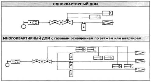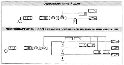 Рисунок 1 Активные меры безопасности при давлении в наружном газопроводе > 0,0015 МПа (150 мм вод.ст.) до 0,005 МПа и приборы, регулирующие давления газа.