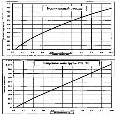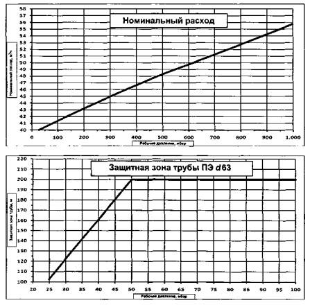 Рисунок 4 Клапан без перепускного байпасного отверстия (выравнивание давления при помощи противодавления). ПРОЕКТИРОВАНИЕ5.5 Клапаны по расходу газа устанавливаются в наружные подземные газопроводы. Температура эксплуатации должна соответствовать требованиям СНиП 42-01. 5.6 При использовании клапанов по расходу в особых природных и климатических условиях следует руководствоваться требованиями СНиП 42-01. Дополнительных мероприятий не предполагается. 5.7 Клапан по расходу устанавливается в газопровод в соответствии с проектной документацией в целях автоматического отключения газопровода и (или) потребителей газа (здания) и предотвращения выбросов газа из трубопровода и его возгорания или взрыва при аварии (разрушении, повреждении) газопровода и (или) технических устройств. 5.8 Клапаны по расходу применяются в соответствии с документацией на клапаны, разработанной и принятой изготовителем, с учетом: назначения; области применения; срока службы; показателей качества; технических характеристик; данных о размещении, монтаже, безопасной эксплуатации и других показателей, содержащихся в инструкциях изготовителя запорных клапанов. 5.9 Функции клапана по расходу имеют две основные особенности: - при нормальном режиме работы клапан остается открытым, даже при максимальном допустимом расходе газа потребителями; - клапан автоматически закрывается в случае повреждения газопровода или технического устройства, как только будет превышено установленное значение максимально допустимого расхода. 5.10 Принцип действия механизма срабатывания клапана основан на калибровании пружины клапана в соответствии с законом Бернулли (о постоянстве давления в установившемся потоке среды в трубопроводе). На правильную работу пружины не оказывают влияния внешние механические воздействия, приложенные к трубопроводу, в том числе и сейсмические колебания. 5.11 Клапаны по расходу с перепускным отверстием можно устанавливать только на участках распределительных уличных газопроводов с обязательной установкой запорного устройства (крана) на расстоянии не более 2 м от клапана по ходу движения газа. 5.12 Клапаны по расходу без перепускного отверстия должны устанавливаться только на газопроводах-вводах. 5.13 В проектной документации при определении места монтажа клапана по расходу рекомендуется учитывать минимальное рабочее давление в месте монтажа. В зависимости от давления может быть рассчитан номинальный расход. 5.14 При проектировании распределительных газопроводов и газопроводов-вводов с использованием клапанов по расходу рекомендуется подбирать соответствующий клапан, исходя из минимального рабочего давления в распределительной сети, предусмотренного для нее максимального расхода газа и соответствующего диаметра, руководствуясь таблицами и/или графиками приложения Б. Подбор клапана с помощью таблицы и/или графика: - С помощью таблицы и/или графика приложения Б выберем запланированный диаметр газопровода; затем - минимальное рабочее давление, в которое попадает давление в газопроводе. - По таблице и/или графику получаем значение Vn максимально возможного номинального расхода газа, протекающего через этот клапан. Максимальная потеря напора также указана в техническом паспорте. Мы сравниваем это значение с максимальным суммарным расходом 