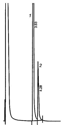 1 - 1,4-бутандиол; 2 - глицерин Рисунок 1 - Хроматограмма раствора для определения коэффициента чувствительности. Определение содержания свободного глицерина 9.3 Определение коэффициента чувствительности Взвешивают приблизительно (100,0 ±0,1) мг глицерина и (100,0 ±0,1) мг 1,4-бутандиола в мерной колбе вместимостью 100 см3, растворяют в 50 см3 этилового спирта (5.3) и доливают водой до метки. Учитывают нагревание и уменьшение объема в результате смешивания воды и спирта. Чтобы рассчитать коэффициент чувствительности, в хроматограф впрыскивают не менее трех раз по 1 мкл этого раствора в вышеуказанных условиях. Раствор стабилен в течение нескольких недель даже при хранении при комнатной температуре. Используя полученные хроматограммы, рассчитывают по следующей формуле коэффициент чувствительности Fr