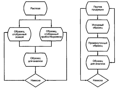 Рисунок 1 - Последовательность отбора и подготовки образца 4.2 Образец (проба) Технология отбора должна обеспечивать получение образца для анализа, представительного по среднему химическому составу расплава или исходного образца. Образец для анализа должен быть в достаточной степени однородным по химическому составу, чтобы незначительная неоднородность не влияла на расхождение результатов определенного метода анализа. Однако для проб, отобранных из расплава, некоторый разброс результатов анализа в пределах одной пробы и между разными пробами будет неизбежным. В этом случае расхождение результатов будет составлять неотъемлемую часть значений повторяемости и воспроизводимости результатов анализа. Образец для анализа не должен иметь поверхностных покрытий, влаги, грязи или других видов загрязнений. По возможности, образец для анализа не должен иметь раковин, трещин и пор, а также задиров, закатов или других поверхностных дефектов. При отборе и подготовке образца для анализа особое внимание требуется в тех случаях, когда ожидается, что проба, взятая из расплава, является неоднородной или каким-либо образом загрязненной. Проба, взятая из расплава, должна остывать таким образом, чтобы химический состав и структура металла образца не менялись от пробы к пробе. Важно понимать, что на результаты анализа некоторыми физическими методами может влиять структура металла. Это, в частности, касается чугуна с белой или серой структурой, а также сталей в состоянии непосредственно после отливки или деформации. 4.2.2 Размеры Размеры промежуточного образца в виде твердого монолита должны быть достаточными, чтобы обеспечивать отбор дополнительных образцов для повторного анализа с использованием альтернативного метода. Должен быть подготовлен образец достаточной массы, позволяющей проводить любой необходимый повторный анализ. Обычно масса, равная 100 г, является достаточной для образца в виде стружки или порошка. Требования к размерам образца для анализа в виде монолита зависит от выбранного метода. В случае оптического эмиссионного спектрального метода анализа и метода рентгеновской флуоресцентной спектроскопии форму и размер образца будут определять размеры камеры (столика/кассеты) для размещения образца. Размеры образцов для анализа, приводимые в настоящем стандарте, следует рассматривать только как иллюстративные. 4.2.3 Идентификация Образцу для анализа должна быть присвоена единственная в своем роде идентификационная маркировка, определяющая номер плавки металла исходного образца, от которого отобрана проба для анализа. В случае необходимости следует также знать технологический режим плавки металла или местоположение на исходном образце - откуда был отобран промежуточный образец или образец для анализа. Образцу для анализа чугуна в чушках должна быть присвоена единственная в своем роде идентификационная маркировка для того, чтобы устанавливать партию или часть груза, а также единичный образец металла, от которых взят образец для анализа. К исходному и промежуточному образцам должны быть прикреплены бирки (этикетки) или использован другой эквивалентный метод маркировки, чтобы гарантировать идентификационную связь с образцом для анализа. Идентификация, статус и состояние образца должны быть зарегистрированы во
