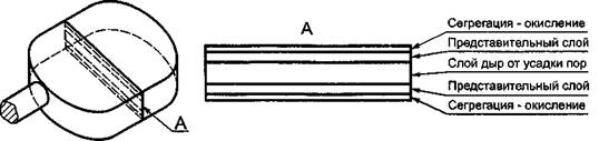 А.6.1 Поверхностные слои образца могут подвергаться сегрегации, а центральная часть может быть пористой и подверженной усадке или другому термическому воздействию (рисунок А.2с), независимо от наличия дефектов и оксидов на поверхности диска. Поэтому необходимо особенно тщательно выполнять процедуры подготовки поверхности диска для анализа физическими методами. В ходе подготовки поверхности образца необходимо открыть слой металла, являющийся представительным по химическому составу.