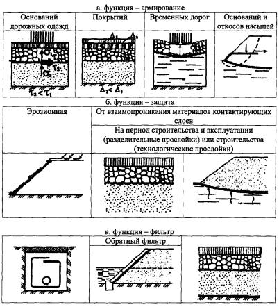 и) Геокомпозиты из нетканого геотекстильного полотна и объединенной с ним геосетки из стекло- или базальтового волокна применяются для армирования покрытий (армогеокомпозиты). Наличие нетканого полотна обеспечивает лучшие условия по контакту с материалами окружающих слоев и лучшее выполнение функций по исключению (снижению) процесса проявления "отраженных" трещин, наличие геосетки обеспечивает армирование вышележащего слоя асфальтобетонного покрытия.