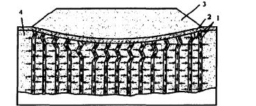 Примечание - 1- геосинтетический материал; 2 - дорожная одежда; 3 - песчаный дренирующий слой; 4 - пространственная георешетка |
