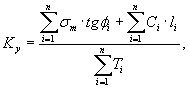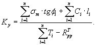 - После анализа результатов оценки при значении Ку < Ктр (при Ктр ≥ 1,3) повторно производят расчет устойчивости насыпи на слабом основании по методу КЦПС с учетом армоэлемента из геосинтетического материала на поверхности основания и определяют требуемые значения дефицита удерживающих сил на армоэлементе и расчетной прочности материала (кН/пог.м) с учетом выражения 8.2.