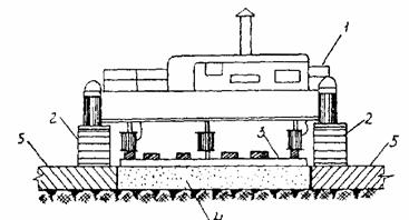 Рис. 2. Схема работы распределителя при укладке пескоцементной смеси на промежуточном ряде: 1 - распределитель; 2 - гусеница; 3 - вибробрус; 4 - пескоцементное основание промежуточного ряда; 5 - затвердевшее пескоцементное основание маячных рядов При устройстве пескоцементного основания выполняют следующие работы: подготовку распределителя к работе; распределение и уплотнение пескоцементной смеси; распределение пленкообразующих материалов для ухода за основанием. Подготовка распределителя к работе С распределителя демонтируют бункер-транспортер, устанавливают машину в начале ряда и ориентируют ее относительно продольной оси ряда.