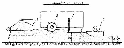Рис. 3. Схема установки рабочих органов распределителя при укладке пескоцементной смеси: 1 - задняя стенка приемного бункера; 2 - шнеко-фрезерный агрегат; 3 - отвал; 4 - вибробрус; h - толщина основания в плотном теле; h1 - толщина слоя рыхлой смеси; δ - запас на уплотнение По натянутому между нижними гранями боковых стенок распределителя шнуру выравнивают шнеко-фрезерный рабочий орган и отвал. В таком положении стрелки индикаторов должны показывать «0». Спереди распределителя монтируют прицепной на пневмоходу приемный бункер-дозатор, а сзади навешивают вибробрус. На распределитель устанавливают удлиненную боковую скользящую опалубку так, чтобы зазор между нижними гранями опалубки и основанием (нижележащим конструктивным слоем) примерно был равен 1 см. После этого рабочие органы распределителя устанавливают в следующее положение (рис. 3): отвал устанавливают выше проектной отметки верха пескоцементного основания на величину запаса на уплотнение - 7 - 8 см; шнеко-фрезерный рабочий орган - на 5 см ниже режущей кромки отвала; вибробрус гидроцилиндрами поднимают в верхнее положение. Заднюю стенку прицепного бункера гидроцилиндрами поднимают на такую высоту, при которой площадь поперечного сечения призмы пескоцементной смеси, укладываемой бункером, была бы равна площади поперечного сечения пескоцементного основания. Пример. Площадь поперечного сечения пескоцементного основания в рыхлом слое равна 7,5×0,28 = 2,10 м2. Площадь призмы смеси, образуемой бункером (рис. 4) при высоте подъема задней стенки над основанием 39 см, равна
