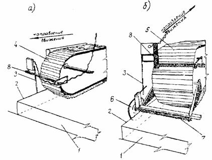 Рис. 5. Установка копир-датчиков на гусеницы распределителя при укладке смеси на промежуточных рядах: а - крепление датчика на передней гусенице; б - крепление датчика на задней гусенице; 1 - пескоцементное основание маячных рядов; 2 - боковые грани основания маячного ряда; 3 - копиры; 4 - передняя гусеница; 5 - задняя гусеница; 6 - диск; 7 - кронштейн с пружиной; 8 - кронштейн для крепления копир-датчика Для этого убирают прицепной приемный бункер, а на распределитель монтируют приемный бункер-транспортер для приема смеси из автомобилей-самосвалов сбоку и перегрузки ее на основание. При этом большей интенсивности работы достигают за счет выгрузки смеси с маячного ряда непосредственно на основание впереди распределителя. Через бункер-транспортер подают меньший объем смеси, необходимый для окончательного дозирования. В конце работы устраивают рабочий шов. Поперек ряда устанавливают доски и закрепляют их штырями. Укладку смеси ведут до доски. Перед доской вибробрус поднимают, а примыкание уложенного слоя, с доской обрабатывают вручную. Когда работы по укладке смеси возобновляют, доску снимают. Распределение пленкообразующих материалов для ухода за пескоцементным основанием Пленкообразующие материалы помароль ПМ-100АМ или лак этиноль распределяют двухполосным финишером ДС-105 (или ТС-280), входящим в комплект бетоноукладочных машин. В начале смены машину готовят к работе, устанавливают ее в начале участка и ориентируют относительно оси уложенного основания. Затем устанавливают и регулируют датчики выдерживания курса и контактные вилочки (копиры) вводят в соприкосновение с внутренней стороной копирной струны. Баки заправляют пленкообразующими материалами. Подбирают и устанавливают необходимые по размеру отверстий сопла, а раму с распределительной системой опускают так, чтобы расстояние от сопел до поверхности пескоцементного основания (высота факела) было равно 45 - 50 см. К распределению пленкообразующих материалов приступают сразу же после того, как будут уложены первые 30 - 50 м основания. Давление в распределительной системе поднимают до 4 - 6 кГ/см2. Распределение пленкообразующих материалов проводят в два приема. За первый прием распределяют половину нормы - 0,4 - 0,5 л/м2. Машину возвращают к началу участка и производят второе распределение при той же норме розлива. Рабочая скорость машины при распределении пленкообразующих материалов должна быть: при норме розлива 0,4 л/м2 - 14 - 16 м/мин; при норме розлива 0,5 л/м2 - 9 - 11 -м/мин. В процессе работы контролируют фактическую норму розлива и, если необходимо, меняют скорость движения машины. В конце работы машину перемещают за пределы готового основания, прочищают сопла и моют их керосином, очищают распределительную систему и моют машину. Устройство следующего конструктивного слоя основания или покрытия разрешается не ранее чем через 14 дней. Требования по качеству работ Готовое пескоцементное основание должно удовлетворять требованиям «Инструкции по применению грунтов, укрепленных вяжущими материалами, для устройства оснований и покрытий автомобильных дорог и аэродромов». СН 25-74, Госстрой СССР, Стройиздат, М., 1975. Отклонения от проектных геометрических размеров не должны превышать: По ширине, см............................................................................... ±5 По толщине слоя, %............................................................