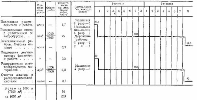 рейкой не Качество уплотнения должно быть хорошим и равномерным по ширине основания и по толщине слоя. Относительная плотность должна быть не менее 0,98. Кромки маячных рядов должны быть прямолинейные, без обрушений. Указания по технике безопасности При устройстве пескоцементного основания следует выполнять требования «Правил техники безопасности при строительстве, ремонте и содержании автомобильных дорог». Транспорт», М., 1969. При работе с пленкообразующими материалами необходимо соблюдать следующие правила техники безопасности: 1. Во время работы машинист распределителя пленкообразующих материалов обязан быть в комбинезоне, в брезентовых рукавицах, в головном уборе и защитных очках. 2. Запрещается вблизи емкостей с пленкообразующими, материалами зажигать огонь или курить. 3. В жаркую погоду в бочках с пленкообразующими материалами создается повышенное давление, поэтому при их открывании следует соблюдать осторожность. 4. При попадании пленкообразующих материалов на кожу рук или лица следует немедленно смыть их керосином, а затем кожу лица или рук вымыть теплой водой с мылом и насухо протереть полотенцем. III. УКАЗАНИЯ ПО ОРГАНИЗАЦИИ ТРУДАДо начала работ по устройству пескоцементного основания выполняют следующее: освобождают полосу работы распределителя от посторонних предметов, материалов; устанавливают копирные струны (для маячных рядов); закладывают временные водопропускные трубы в пониженных местах для выпуска воды из промежуточных рядов; сосредоточивают на участке работ необходимые машины, оборудование, инструмент, материалы (см. раздел VI «Материально технические ресурсы»); ограждают участок работ шлагбаумами и сигнальными знаками; подготавливают и содержат в исправном состоянии пути подвоза пескоцементной смеси. В сухую и жаркую погоду их периодически поливают для уменьшения пыли и создания безопасной работы автотранспорта; участок работ обеспечивают передвижными вагончиками (вагон для мастера с кладовой, вагон-душевая, вагон-столовая), питьевой водой и водой для технических целей, передвижными туалетами, медицинской аптечкой. Работы по устройству пескоцементного основания ведут, как правило, в две смены, при этом для каждой смены назначают захватку длиною 500 м. Для работы в каждую смену организуют звено рабочих следующего состава: Машинист распределителя 6 разр. - 1 Помощник машиниста 5 » - 1 Машинист двухполосного финишера для распределения пленкообразующих материалов 5 » - 1 Дорожные рабочие 3 » - 2 » » 2 » - 1 Машинист распределителя и его помощник в начале смены готовят машину к работе, устанавливают датчики и ставят копиры на струну, устанавливают рабочие органы распределителя на выполнение рабочей операции. В процессе работы машинист управляет распределителем, приемным бункером и вибробрусом, а помощник машиниста, следуя за машиной, ведет контроль качества работы (ровность, поперечный уклон, толщину слоя и с лаборантом - качество уплотнения). При кратковременной отлучке машиниста помощник заменяет его. Машинист двухполосного финишера распределяет пленкообразующие материалы по готовому пескоцементному основанию. Дорожный рабочий 3 разр., перемещаясь впереди распределителя, опускает струну для въезда автомобилей-самосвалов, руководит движением этих машин, ведет учет поступающей смеси. По мере 