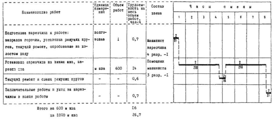 Примечания. 1. Цифры над линиями указывают число рабочих, а под линиями - продолжительность операции в минутах. 2. Затраты труда на доставку воды в график не включены, они определяются в зависимости от расстояния и условий подвоза воды. 3. Отдых рабочим в течение смены предоставляется поочередно. Во время отдыха машиниста его подменяет помощник. V. ОСНОВНЫЕ ТЕХНИКО-ЭКОНОМИЧЕСКИЕ ПОКАЗАТЕЛИТрудоемкость на 1000 м шва, чел-дн..................................................................... 3,33 Средний разряд рабочих.......................................................................................... 3,5 Коэффициент использования нарезчика по времени в течение смены............. 0,88 VI. МАТЕРИАЛЬНО-ТЕХНИЧЕСКИЕ РЕСУРСЫА. Основные материалы