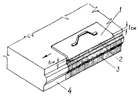 Рис. 1. Общий вид распределителя бетонной смеси: 1 - рама распределителя; 2 - бункер для приема смеси; 3 - транспортер; 4 - гусеничная тележка; 5 - силовая установка; 6 - пульт управления; 7 - топливный бак; 8 - датчик уровня с копиром; 9 - датчик направления с копиром Машина состоит из главной рамы и сочлененной с ней рамой перегружающего оборудования (бункера-транспортера). На главной раме смонтированы силовая установка, шнеко-фрезерный рабочий орган и отвал. В передней части рамы распределителя расположена балка (брус) для обрушения и разравнивания выгруженных на основание куч бетона (в случае, когда выгрузку бетона осуществляют непосредственно на основание впереди распределителя). Перегружающее оборудование представляет собою ленточный транспортер с приемным бункером. Транспортер может перемещаться как за габариты, так и внутрь рамы. Шнеко-фрезерный рабочий орган служит для распределения смеси по всей ширине бетонируемой полосы покрытия, а отвал обеспечивает необходимую толщину распределяемой цементобетонной смеси. Шнеко-фрезерный рабочий орган и отвал состоят из двух частей. Каждая из частей может изменять свое положение в вертикальной плоскости, обеспечивая необходимый профиль бетонируемого ряда. Для ограничения ширины распределения цементобетонной смеси распределитель оборудован боковыми формами. Для осуществления контроля за установкой рабочих органов и их точной регулировки на машине установлены механические индикаторы уровня. Стержни индикатора закреплены у нижнего конца установочными винтами в кронштейнах. Эти кронштейны крепятся в верхней части рабочего органа по концам каждой его половины. При подъеме или опускании рабочего органа поднимается или опускается стержень индикатора, и его стрела перемещается по шкале. Всегда необходимо проверять надежность закрепления и прямолинейность стержня. Распределитель может работать как в автоматическом режиме по натянутой копирной струне, так и на ручном управлении. При укладке цементобетонной смеси распределителем выполняют следующие работы: - подготовка участка работ к укладке бетона; - подготовка распределителя бетона к работе; - укладка цементобетонной смеси распределителем. 1. Подготовка участка работ к укладке бетона До начала укладки бетона распределителем для устройства нижнего слоя цементобетонного покрытия должны быть выполнены следующие работы: - устроено пескоцементное основание и принято технической инспекцией (см. технологическую карту «Устройство пескоцементного основания аэродромов распределителем бетона PST-28-300, оборудованным вибробрусом», М., Оргтрансстрой, 1976); - установлены копирные струны для работы распределителя на автоматическом режиме выдерживания курса и уровня (см. технологическую карту «Установка копирных струн при устройстве оснований и покрытий аэродромов», М., Оргтрансстрой, 1976); - нанесена на поверхность пескоцементного основания (за сутки до начала работ по укладке бетона) изолирующая прослойка из быстрораспадающейся битумной эмульсии с расходом 1,5 - 2,0 кг/м2; - сооружены временные подъездные пути для доставки цементобетонной смеси и обеспечен водоотвод с них; - смонтирована, отлажена и подготовлена к работе смесительная установка «Рекс». Рис. 2. Шаблон для предотвращения попадания разжиженного битума или мастики на кромку 