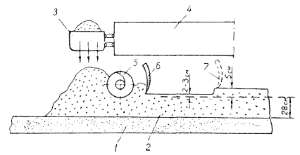 Рис. 3. Схема установки рабочих органов машины PST-28-300 при распределении бетонной смеси: 1 - пескоцементное основание; 2 - слой распределенной цементобетонной смеси; 3 - бункер-транспортер; 4 - рама распределителя; 5 - шнеко-фрезерный рабочий орган; 6 - отвал (положение отвала в установившемся потоке); 7 - положение отвала в начале работы Шнеко-фрезерный рабочий орган (его самая нижняя точка) устанавливается на 5 см ниже верха проектной отметки устанавливаемого покрытия. Отвал регулируется в процессе распределения смеси. В начальный период распределения на захватке длиной 15 - 20 м отвал поднимают на 5 см выше поверхности покрытия. Такая установка отвала обеспечивает набор бетоноукладчиком бетонной смеси с образованием валиков перед рабочими органами. После этого отвал опускают для создания припуска 2 - 3 см. В каждом конкретном случае в зависимости от пластичности цементобетонной смеси и погодных условий величина припуска на уплотнение устанавливается и контролируется лабораторией. При определении припуска на уплотнение необходимо учитывать и то обстоятельство, что ширина раскладываемой распределителем полосы бетона должна быть немного меньше ширины бетонируемого ряда (так, например, при ширине бетонируемого ряда 7,5 м ширина раскладываемой полосы распределителем будет составлять 7,0 - 7,2 м). Установка машины на ось бетонируемого ряда, наладка боковых форм и установка распределителя относительно струны для обеспечения автоматического выдерживания курса и высотных отметок производятся аналогично технологическим операциям при укладке цементобетонной смеси бетоноукладчиком SF-24-400 (см. технологическую карту «Устройство аэродромных цементобетонных покрытий бетоноукладочной машиной SF-24-400 (SF-425)», М., Оргтрансстрой, 1976). 3. Укладка цементобетонной смеси распределителем Цементобетонную смесь доставляют к месту укладки большегрузными автомобилями-самосвалами и выгружают непосредственно в перегружающее оборудование распределителя - бункер-транспортер. Для подъезда к бункеру-транспортеру автотранспорта с бетоном используют примыкающую к бетонируемому ряду полосу покрытия смежного ряда с затвердевшим бетоном или полосу цементобетонного основания. Работу организуют в такой последовательности. Автомобиль-самосвал с бетоном проезжает чуть вперед распределителя (на 5 - 10 м) по готовому покрытию или основанию смежного ряда (в это время у распределителя бункер-транспортер расположен внутри рамы) и останавливается. Выдвигают бункер-транспортер и автомобиль-самосвал задним ходом подъезжает к нему для выгрузки смеси. По мере поднятия кузова смесь постепенно сползает в бункер, где с помощью ленточного транспортера перемещается на основание. После окончания очистки дна и стенок кузова от налипшей цементобетонной смеси автомобиль-самосвал отходит, а бункер-транспортер убирают внутрь рамы для возможности подъезда следующего автомобиля-самосвала. Для более четкой организации выгрузки смеси с наименьшими затратами времени на подход автомобиля-самосвала к бункеру-транспортеру необходимо на передней стенке бункера нанести краской черту - точку соприкосновения левого заднего колеса автосамосвала со стенкой бункера. Это облегчит работу водителю автосамосвала и исключит возможность столкновения правого борта автосамосвала с рамой