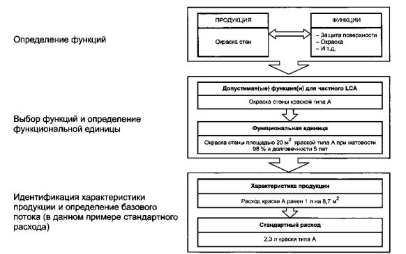 Рисунок 1-Общее представление примера Примечание-Процесс определения можно начинать либо с продукции, либо с самой функции. Последовательность данных этапов отображена на рисунке 1, используя в качестве примера процесс окраски стен. Этот пример также использован в 3.3 - 3.5. Дополнительные примеры приведены в 3.6. 3.3 Определение функцийЦелью функциональной единицы является получение количественной характеристики услуги, предоставляемой системой выпуска продукции (продукционной системой). Отправным пунктом при определении функций может быть специфическая продукция, подлежащая исследованию (например, краска для стен) или конечная потребность или цель, которая в некоторых случаях может быть удовлетворена или достигнута с помощью нескольких разных продукций (например, покрытие стен может быть обеспечено, как с помощью краски, так и с помощью обоев или комбинацией того и другого). Как правило, функции относятся к специфической продукции или свойствам процесса, каждая из которых может: - удовлетворять специфическим потребностям и вследствие этого иметь потребительскую стоимость, которая реализует экономическую выгоду для поставщика определенной продукции; - влиять на функционирование других экономических систем (например, обои не обладают значительным эффектом изоляции, что затрагивает требование к отоплению здания). 3.4 Выбор функций и определение функциональной единицыНе все функции могут иметь отношение к частной ОЖЦ. Таким образом, из всех имеющихся функций должны быть выявлены только необходимые. Например, для твердой внутренней стены защита поверхности может оказаться ненужной до тех пор, пока окрашивание является наиболее существенной функцией краски. Позднее необходимые функции определяют количественно в функциональных единицах, которые могут быть выражены в виде комбинации разных параметров. Для окраски стены функциональная единица должна определять площадь покрытия (например, В случае многофункциональных единиц различные количества могут быть связаны между собой, например изоляционный материал для покрытия стены может иметь предварительно окрашенную поверхность, что делает окраску стены ненужной, обеспечивая, таким образом, как изоляцию, так и окраску. В этом случае функциональной единицей может быть следующая: «Стена площадью Другие примеры многофункциональных единиц приведены в таблице 2. Таблица 2 - Примеры функциональных единиц для многофункциональных систем