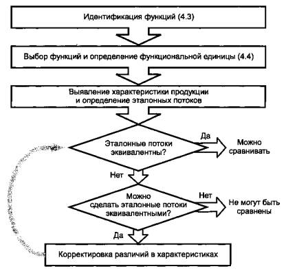 Рисунок 2 - Общие этапы в процессе сравнительных исследований При сравнении продукционных систем особое внимание следует уделять подтверждению того, что сравнение проводится на основе одной и той же функциональной единицы и эквивалентных условий принятия решения, таких как рабочая характеристика, границы системы, качество данных, методы распределения, правила принятия решений по оценке входных и выходных данных. В настоящем разделе приведено описание некоторых возможных подходов с иллюстрацией в виде примеров. Общие этапы, которые должны быть выполнены в процессе сравнительных исследований, указаны на рисунке 2. 4.3 Идентификация и выбор функцийОпределение функциональной единицы взаимосвязано с целью исследования. Если цель-сравнение продукционных систем, то особое внимание следует обратить на гарантию того, что сравнение является достоверным, дополнительные функции выявлены и описаны, а также учтены все функции, которые имеют отношение к цели исследования. Пример 1 - В исследование менеджмента отходов следует включить дополнительно функции, с помощью которых повторно используют отходы (т. е. функции, выполняемые системами для снабжения повторно используемыми материалами или энергией). Пример 2 - В исследование электрооборудования бытового назначения следует включить потери тепла, подаваемого в здание, в котором работает данное оборудование, так как это влияет на интенсивность необходимого отопления и/или охлаждения. При поведении сравнительных исследований выбор функций становится еще более важным, чем при исследовании без сравнения. Проиллюстрируем это на примере функций, приведенных в таблице 3: - для бутылок исключение функции внешнего вида упаковки может привести к простому сравнению упаковок, которые с технической стороны подобны (т.е. содержат одинаковое количество напитка), но которые изготовители или потребители не признают аналогичными; - для систем, предназначенных для сушки рук, исключение гигиенической функции будет неприемлемым, например, в пищевой промышленности, где способность полотенец для рук удалять бактерии считают преимуществом, не позволяющим сравнивать их с обычными электрическими системами для сушки. 4.4 Эквивалентность базовых потоковФункциональная единица в примере с краской (см. раздел 3)