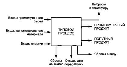 Рисунок 3-Общее представление установленных входов, выходов и границ системы 5.3 Определение типовых процессов продукционной системы и их границХранение информации обо всех типовых процессах, которые составляют продукционную систему, необходимо для обеспечения поставок продукции и цепочек применений, согласующихся с целью и областью исследования. Типовой процесс с его связанными входами и выходами представлен на рисунке 4. Примером типового процесса может быть «плавка алюминия», являющаяся частью продукционной системы. Этот типовой процесс преобразует входы сырья или промежуточного материала (очищенного оксида алюминия), связанные с вспомогательным материалом, энергией и выбросами в окружающую среду, в промежуточную продукцию, которая затем обрабатывается в пределах продукционной системы. При таком преобразовании могут быть установлены специальные процессы, осуществляющие данные преобразования. Впоследствии подготавливают список мест, откуда должны поступать отчеты, имеющие отношение к цели и области исследования. Чтобы установить границы типового процесса, следует установить контакты с рабочими площадками с учетом занятости, представляющей интерес, для определения наименьших частей продукционной системы, для которых имеется доступная информация. Так как существует широкое разнообразие специальных процессов, которые осуществляются на определенной рабочей площадке, то границы типового процесса устанавливают путем сведения к минимуму необходимости проведения процедур распределения.
