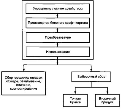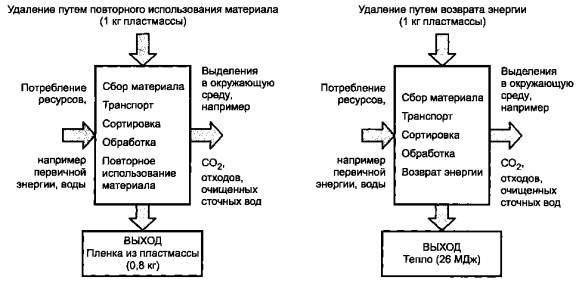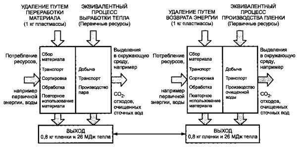 в различные виды продукции, в зависимости от варианта возврата. В качестве примера на рисунке 8 показаны входы и выходы, связанные с альтернативной переработкой Для облегчения сравнения этих двух вариантов может быть применено расширение границ системы в соответствии с рисунком 9.