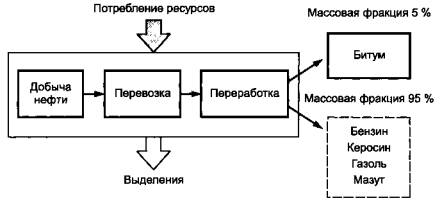 Рисунок 11 - Потребление топлива грузовым автомобилем в зависимости от перевозимого груза Задача транспортных средств перевозить, по возможности, наибольшее число предметов потребления, но часть грузоподъемности грузового автомобиля всегда приходится на упаковки, необходимые для перевозки. Следовательно, масса упаковок, а также их конструктивное исполнение оказывают существенное влияние на максимальную перевозимую массу предметов потребления. Для распределения сначала должно быть установлено, осуществлялось использование грузового автомобиля из расчета грузоподъемности или вместимости, и необходимо ли определять долю упаковки. Для этого требуется определить следующие пять основных значений: - максимальную грузоподъемность грузового автомобиля; - максимальную вместимость кузова автомобиля; - плотность содержимого; - реальную массу содержимого; - реальную массу упаковок. Далее приведены два примера распределения при использовании грузоподъемности и вместимости грузового автомобиля с допущением, что максимальная грузоподъемность автомобиля равна действительной нагрузке. 1) Использование грузоподъемности. Грузовой автомобиль с максимальной массой нагрузки 40 т и полезной нагрузкой 25 т перевозит 25 т наполненных упаковок, т.е. в пределах своей полной грузоподъемности. На долю упаковок приходится 5 т. Это означает, что 20 % грузоподъемности приходится на упаковки и соответственно 20 % экологических входов данной транспортировки (масса без груза и полезная нагрузка) должны быть отнесены к упаковкам. 2) Использование вместимости. Тот же самый грузовой автомобиль нагружен до полной вместимости и перевозит 17 т упаковок, заполненных теми же предметами потребления. 2 т из 17 т полезной нагрузки приходятся на упаковки (тару). Вследствие большого объема использованного упаковочного материала перевозимая масса предметов потребления составляет 15 т, что соответствуют 60 % максимальной нагрузки. 40 % грузоподъемности приходится на упаковки и в соответствии с этим 40 % собственной массы автомобиля приходится на упаковки. С учетом общей полезной нагрузки процент упаковок составляет 12%. Следовательно, только 12 % экологических входов, связанных с полезной нагрузкой, приходится на упаковки. 7.3.2 Пример распределения на экономической основе Битум производят на нефтеочистительных заводах, также как другие попутные продукты, например, бензин, керосин, газойль и топочный мазут. В процессе переработки нефти получают 5 % массовой фракции битума и 95 % массовой фракции другой попутной продукции. Для упрощения1) добычу нефти, транспортирование и процесс переработки рассматривают как один типовой процесс с набором входных и выходных данных {Di}, включая истощение нефтяных ресурсов, потребление топлива, выбросы газов при транспортировании и выделения, к которым относят, например, расходы на эксплуатацию промысла, отходы процесса переработки и отработанный катализатор, как показано на рисунке 12. 1) Любое упрощение анализа нуждается в обосновании во избежание неправильного понимания. 20