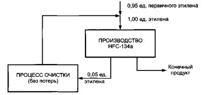 Рисунок 14-Общее представление повторения цикла Установлено наблюдение, чтобы распределение не возникало при повторном использовании по замкнутому и разомкнутому циклу (с процедурой замкнутого цикла). 8.3 Описание примеров8.3.1 Пример повторного использования по замкнутому циклу В процессе производства HFC-134a, используемого в качестве альтернативного фторуглеводородного хладагента, применяют этилен в качестве компонента сырья, но после реакции остается доля этилена (0,05 ед.) и с ней обращаются как с субстанцией, которую планируется использовать повторно. Для этого примера может быть применен метод распределения по замкнутому циклу. Этилен на выходе замещает эквивалентное количество этилена на входе, необходимого для следующей загрузки, и чистое потребление этилена уменьшается до 0,95 ед. в расчете на производственный цикл. Возможно, что этилен, остающийся в результате процесса, будет не таким чистым, как первичный этилен входящего потока. Поэтому в данном процессе может быть проведен дополнительный этап очистки, чтобы довести этилен повторного использования до такого же уровня качества, как первичный материал. В результате границы исследуемой системы расширяются. Метод распределения по замкнутому циклу остается применимым к расширенной системе и позволяет уклониться от необходимости расширения. Последовательность технологических операций в этом случае приведена на рисунке 15.