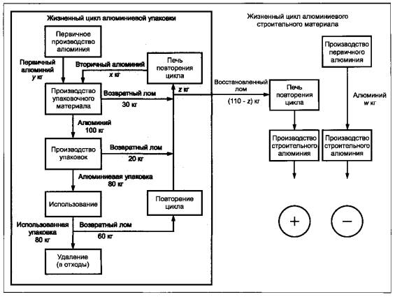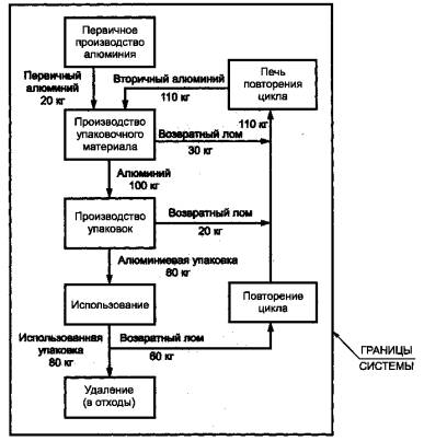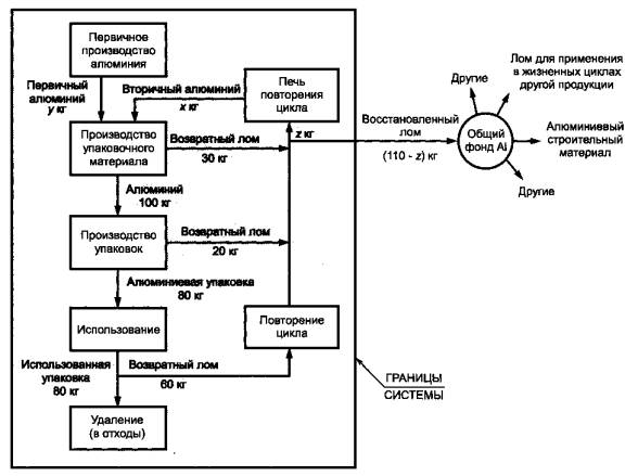 Рисунок 15- Пример последовательности операций повторного использования по замкнутому циклу Чистое потребление этилена остается одним и тем же в этом примере, но к исследуемому ИАЖЦ этой системы должно быть добавлено и другое потребление (например, расход электроэнергии), а также выбросы. 8.3.2 Примеры технологии повторного использования по замкнутому циклу Существуют случаи, когда повторение цикла в специальной производственной системе происходит в независимых материальных фондах специальной продукции для повторного использования стекла, стали, алюминия и т.д. Система выпуска специальной продукции поставляет сырье в общий фонд и получает вторичный материал из этого фонда. Если импорт и экспорт вторичного сырья между общим фондом и жизненным циклом специальной продукции являются эквивалентными, то система выпуска специальной продукции может быть смоделирована аналогично повторному использованию по замкнутому циклу. Если осуществляется только экспорт или импорт вторичного сырья, то должен использоваться разомкнутый цикл (с технологическим процессом по замкнутому циклу) и необходимо дополнительное рассмотрение вопросов в отношении обращения с попутными продуктами. Возникает проблема распределения в отношении выгоды повторного использования экспорта или импорта. Пример производства алюминия поясняет данную проблему и предоставляет решение проблемы распределения. Упрощенный жизненный цикл алюминиевой упаковки приведен на рисунке 16. В применяемой на практике технологии, требующей спецификации для алюминиевой упаковки, используется фиксированный процент содержания алюминия, полученного из вторичного сырья. Следовательно, количество восстановленного металлического лома больше, чем входная пропускная способность этой системы.
