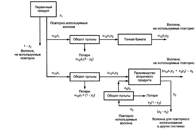 z1 = 0,70; u12 = 0,25; u13 = 0,75; z3 = x3 = 0,5; y3 = 1,0 Рисунок 21 – Разные применения отходов и извлеченного КВРВ u13 - фракция волокон z1, которые повторно используют для изготовления вторичной продукции. Сумма u12 + u13 равна 1,0; у2 - извлечение волокон из оборотной пульпы для изготовления тонкой бумаги; y3 - извлечение волокон из оборотной пульпы для повторно используемой продукции; z3 - фракция повторно используемой продукции, которую используют в дальнейшем; х3 - фракция повторно используемой продукции в системе с разомкнутым циклом; z3 = х3 отсутствие повторного использования волокон после их использования в системе с разомкнутым циклом. Для повторного использования, представленного на рисунке 21, общее число применений и для z1 волокон может быть вычислено следующим образом: и = 1 - первое применение повторно используемой первичной продукции; + z1 u12 у2 - применение повторно используемой продукции для производства тонкой бумаги; + z1 u13 у3 - применение повторно используемой продукции (первый проход); + z1 u13 у3 (z3 y3) - применение повторно используемой продукции (второй проход); + z1 u13 у3 (z3 y3)2 - применение повторно используемой продукции (третий проход); + z1 u13 у3 (z3 y3)n-1 - применение повторно используемой продукции (n-й проход) или u = 1 + (z1 u12 у2) + (z1 u13 у3)×[1 + (z3 y3) + (z3 y3)2 + ...]. Вычисление последнего элемента и группирование приводит к следующему результату: и = 1 + z1 [(u12 y2) + (u13 у3)×(1/(1-(z3 у3)]. Следовательно, общее число применений волокна, предназначенного для повторного использования, составляет и = 1 + z1 [(u12 y2) + (u13 у3)×(1/1-(z3 у3)]. 8.3.3.4 Вычисление фактора распределения на основе числа применений После определения числа применений и, равного 2,225, фактор распределения вычисляют следующим образом. Если фракцию z1 беленого КВРВ извлекают при последующих применениях в других продукционных системах, то 1-z1 общей загрузки остается в первичной (исходной) системе, a z2 всех загрузок прибавляют ко всему количеству применений повторно используемой продукции. Необходимо помнить, что первичный (исходный) материал также входит в эту фракцию. Фактор распределения конечной загрузки для системы выпуска первичной (исходной) продукции определяют следующим образом: (1-z1) + (z1/u). Этот подход к распределению, основанный на общем количестве применений плюс первое, применим к системе выпуска первичной (исходной) продукции и ко всем системам выпуска продукции из отходов. Так как z1 = 0,70 и u = 2,225, то фактор распределения для системы выпуска первичной (исходной) продукции составляет (1 - 0,70) + (0,70/2,225) = 0,30 + 0,316 = 0,6146. Точно так же все количество применений повторно используемой продукции из извлеченного материала повторно используемого КВРВ получит фактор распределения, равный z1 (и - 1)/и = 0,70 (2,225 - 1)/2,225 = 0,3854. Сумма фракций оригинала и общего количества системы выпуска повторно используемой продукции должна быть равна 1,0. Необходимо проверить следующее условие: 0,6146 + 0,3854=1,000. 8.3.3.5 Конечные загрузки разных систем Загрузки различных систем распределяются следующим образом. Для первичной (исходной) системы все загрузки продукционных систем для картона КВРВ в расчете на функциональную единицу умножают на фактор распределения 0,6146. Это показывает важность системы выпуска первичной (исходной) продукции в результатах инвентаризационного анализа. Значительная фракция продукционной системы первичной (исходной) продукции проходит по все