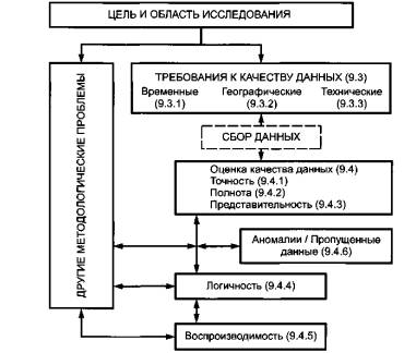 Рисунок 22 - Процедура проведения оценки качества данных Последовательная процедура проведения оценки качества данных, требования к качеству данных и показатели качества данных, которые допускается использовать в ИАЖЦ, приведены на рисунке 22. 9.3 Требования к данным для составления особого списка местЦель исследования - установить основу для определения областей, зависящих от времени, географического места и технологических требований исследования. Эта деятельность в рамках исследования является важным первым этапом для установления требований к качеству данных. 9.3.1 Область исследования, зависящая от времени Необходимо принять несколько решений, касающихся типа и источника данных, которые предполагается использовать в исследовании. Срок давности первичных данных, которые зависят от места расположения объекта исследования, и вторичные данные (например, опубликованные источники) могут быть приведены для уточнения. Пример - Области исследования могут быть определены путем использования источников обоих типов. Области могут быть определены путем использования обоих типов данных, полученных из разных источников. Например: - первичных данных, полученных из специальной компании за последний год; - вторичных данных, опубликованных в различных источниках за последние пять лет. Следует отмечать случаи, когда срок давности данных не соответствует цели определения области исследования. Фактически измеренные данные следует считать наилучшими, так как они обеспечивают понимание изменчивости, присущей процессам, которые предполагается моделировать. Однако данные, должным образом подтвержденные документами, расчетами или оценками, также являются очень ценными. По возможности, данные собирают за минимальный период - один год. Такие данные обеспечивают ясность понимания потенциальных сезонных воздействий, изменений естественных процессов и возникновения непредвиденных событий. В дополнение к специальному периоду исследования рекомендуется добавлять обзор за 12 месяцев, чтобы проверить последовательность и облегчить выявление аномалий или потенциальных ошибок в отчетах. 9.3.2 Географический охват Пространственная граница области исследования может включать в себя зависимое от места расположения оборудование, являющееся частью производственной системы для исследования, которое может быть в дальнейшем распространено на особый район или сектор рынка. Исследование можно расширить до размеров зависящего от места расположения участка. В этом случае каждая участвующая компания первоначально устанавливает количество включаемой продукции, впоследствии прослеживаемой в обратном направлении через цепочку поставки продукции до возврата продукции, ее повторного использования и удаления. Цепочка поставки продукции может быть распространена за пределы того региона, где продается продукция, особенно в случае, когда в исследовании участвуют поставщики сырья. Важно обеспечить поток продукции соответствующими документами, так как они являются основой для менеджмента информации и последующей оценки качества данных. Документы также являются основой для оценки степени завершенности исследования. 9.3.3 Используемые технологии Перечень специальных производственных участков, которые предоставляют данные, используют дл