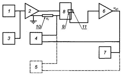 1 - генератор частоты; 2 - усилитель мощности; 3 - частотомер; 4 - измеритель отношения напряжений; 5 - осциллограф (необязательный элемент); 6 - согласующее устройство (усилитель заряда); 7 - измеритель коэффициента гармоник; 8 - вибростенд с катушкой возбуждения; 9 - калибруемый акселерометр; 10 - образцовый резистор; 11 - добавленный груз Рисунок 1 - Блок-схема испытательной установки для определения комплексной электрической проводимости Y Измерения проводят вначале без добавленного груза, а потом с добавленными грузами, устанавливаемыми на подвижный элемент. При этом комплексную электрическую проводимость, полученную при измерении без груза, обозначают Y0, а с использованием n-го груза - Yn. При измерении Ud важно, чтобы на клеммах заземления акселерометра и образцового резистора был одинаковый электрический потенциал. Измерения повторяют для всех амплитуд ускорения, используемых при калибровке. 8.2.2 Измерения для определения комплексного отношения напряжений (Uv при разомкнутых цепях В процессе данных измерений (см. рисунок 2) катушка возбуждения вибростенда работает как велосиметр. Значение комплексного отношения напряжений Uv рассчитывают по формуле Uv = ua2/uc, где иа2 - напряжение на разомкнутом выходе акселерометра; ис - напряжение на разомкнутом входе катушки возбуждения, когда в качестве источника вибрации, приводящего в движение подвижный элемент, использован вспомогательный вибровозбудитель или вторичная катушка возбуждения вибростенда. Измерения проводят без добавленных грузов. При измерении Uv важно, чтобы на клеммах заземления акселерометра и катушки возбуждения вибростенда был одинаковый электрический потенциал.