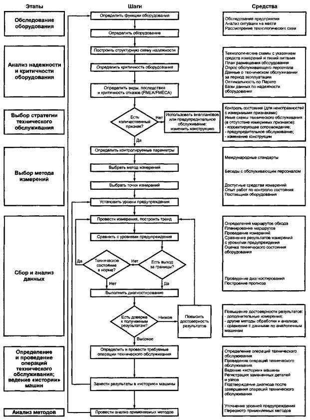 Рисунок 1 - Блок-схема программы мониторинга оборудования 6.4 Другие стратегии технического обслуживания Если отказ не обладает ярко выраженным диагностическим признаком, позволяющим получить его количественную оценку, то возможно применение других стратегий технического обслуживания: корректирующее сопровождение, планово-предупредительное техническое обслуживание. Как вариант, можно рассмотреть целесообразность внесения изменений в конструкцию машины. 7 Измерения7.1 Методы измерений После того, как выбраны параметры, подлежащие измерению в целях контроля состояния и диагностирования, необходимо установить метод или методы их измерений. В приложении А приведены параметры, наиболее часто используемые для оценки технического состояния машин разных видов. Системы мониторинга могут быть стационарными, полустационарными или переносными, а также предусматривать отбор проб (например, жидкости или других материалов) для последующего анализа на месте или в лабораторных условиях. 7.2 Точность измерений Обычно измерения параметров в целях контроля состояния и диагностирования не требуют такой точности в определении абсолютных значений величин, как, например, при проверке рабочих характеристик оборудования. Это связано с тем, что в задачах контроля и диагностики эффективным средством является наблюдение тренда параметров, при котором повторяемость измерений более важна, чем точность измерения абсолютных значений. Приведение результатов измерений, например, к стандартным условиям по давлению и температуре, не является обязательным при текущем контроле состояния оборудования. 7.3 Техническая реализация измерений Необходимо рассмотреть способ технической реализации измерений с учетом таких факторов, как доступность точек измерений, уровень сложности системы сбора данных, требования к обработке данных, безопасность, стоимость, а также возможность дальнейшего использования уже существующих средств контроля. Рекомендуется, чтобы процесс контроля и принятия решений охватывал оборудование в целом. 7.4 Режим работы оборудования в процессе измерений Контроль следует проводить, по возможности, когда достигнуты заранее определенные рабочие условия (например, при нормальной рабочей температуре), или - при наблюдении переходных процессов - заранее установленные начальные и конечные условия процесса (например, выбега). Существуют режимы работы, используемые для определения базовых уровней контролируемых параметров для машины данной конструкции. Результаты последующих измерений сравнивают с базовым уровнем для выявления изменений состояния машины. Тренд результатов измерений позволяет выявить развитие неисправности. 7.5 Интервал между измерениями Следует правильно выбрать интервал между измерениями, а также вид измерений - непрерывные или периодические. Интервал между измерениями зависит, в первую очередь, от вида возможной неисправности и скорости ее развития, т.е. от скорости изменения соответствующего контролируемого параметра. Другими факторами, оказывающими влияние на выбор интервала между измерениями, являются коэффициент использования машины, ее стоимость и то, насколько важно обеспечить ее безотказность. 7.6 Период сбора данных При измерениях в стационарном режиме установленный период сбора данных до