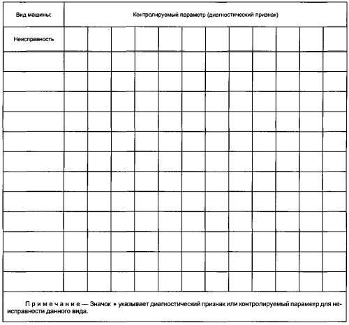 На рисунке В.2 приведен пример заполнения для машины конкретного вида, перечислены наиболее типичные неисправности и параметры, по результатам измерений которых можно судить о появлении той или иной неисправности.