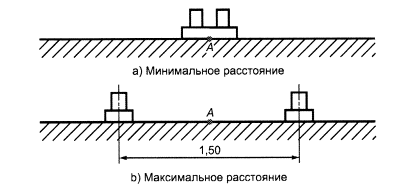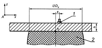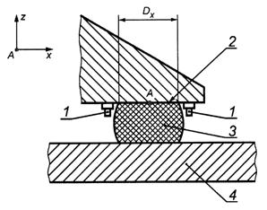 1 - акселерометры Рисунок 3 - Положение акселерометров для измерений vz и Ωy при недостаточном месте для их размещения со стороны изолятора `Для определения угловой скорости Ωx в направлении вокруг оси х пару акселерометров устанавливают так же, как на рисунках 2 и 3, но повернутыми на 90° вокруг оси z. Для измерений скоростей поступательного движения vx и vy в направлениях х и у соответственно пару акселерометров устанавливают следующим образом: a) предпочтительно симметрично относительно точки А на расстоянии от нее от 0,25 Dx до 0,75 Dx или от 0,25 Dy до 0,75 Dy (Dy - размер области контакта в направлении у); b) как показано на рисунке 3. Также устанавливают акселерометры для измерений угловой скорости Ωz в направлении вращения вокруг оси z. Если точка А находится посередине между осями чувствительности акселерометров, то составляющие поступательного движения будут измерены неточно, что потребует введения поправок в соответствии с приложением С. Акселерометры устанавливают на опору машины в соответствии с ГОСТ ИСО 5348. 5.4.2 Альтернативный способ размещения датчиков вибрации В некоторых случаях для измерений вибрации опоры вместо пары акселерометров можно использовать один акселерометр. Условия допустимости такой замены будут неодинаковы для разных составляющих вибрации. Составляющую скорости vz можно измерить с помощью одного акселерометра для измерения поступательной вибрации, установленного на верхней поверхности опоры, при выполнении следующих условий (см. рисунок 4):