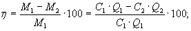 где h - степень очистки газа (эффективность работы ГОУ), %; M1 - массовое выделение загрязняющего вещества с газовым потоком, поступающим на очистку, г/с; М2 - массовый выброс загрязняющего вещества после очистки, г/с; М3 - масса загрязняющего вещества, уловленная в ГОУ, г/с; С1 и С2 - средние концентрации вещества в воздухе на входе в ГОУ и на выходе из нее соответственно, мг/м3; Q1 и Q2 - объемные скорости газового потока на входе и выходе ГОУ, приведенные к нормальным условиям, м3/ч. 7.5.14.1 В случае неизменности объемных скоростей газового потока на входе и выходе ГОУ, т.е. когда Q1 = Q3, для определения степени очистки допускается применение упрощенной формулы (10): h = 1 - С2/С1. (10) 7.5.14.2 При контроле многоступенчатых ГОУ, включающих N последовательно работающих аппаратов, степень очистки газа определяют по формуле (11):