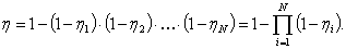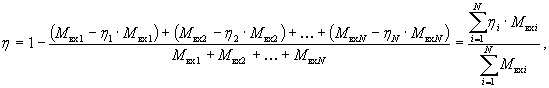 7.5.15 Если через источник выброса в атмосферу поступают очищенные газы от нескольких ГОУ, каждая из которых используется для очистки газов от одного и того же вещества, суммарную степень очистки по данному веществу определяют по формуле (12):