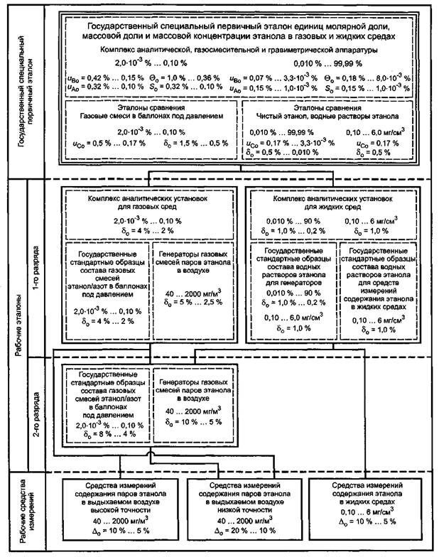4.2 Диапазон значений молярной доли этанола в газовых средах составляет от 2,0•10-3 % до 0,10 %. Диапазон значений массовой доли этанола в жидких средах составляет от 0,010 % до 99,99 %. Диапазон значений массовой концентрации этанола в жидких средах составляет от 0,10 до 6,0 мг/см3. 4.3 Государственный специальный первичный эталон (эталонный комплекс аппаратуры) обеспечивает воспроизведение единиц молярной доли, массовой доли и массовой концентрации этанола в газовых и жидких средах со средними квадратическими отклонениями результатов измерений, неисключенными систематическими погрешностями и стандартными неопределенностями, значения которых не превышают: а) для воспроизведения единицы молярной доли этанола в газовых средах в диапазоне от 2,0•10-3 % до 0,10 %: - среднее квадратическое отклонение результата измерений So от 0,32 % до 0,10 % при проведении 10 независимых измерений; - неисключенная систематическая погрешность Θo от 1,0% до 0,36% (при доверительной вероятности Р = 0,99); - стандартная неопределенность, оцениваемая по типу А, и uАо от 0,32% до 0,10% при проведении 10 независимых измерений; - стандартная неопределенность, оцениваемая по типу В, иВо от 0,42% до 0,15%; б) для воспроизведения единицы массовой доли этанола в жидких средах в диапазоне от 0,010% до 99,99%: - среднее квадратическое отклонение результата измерений So от 0,15 % до 1,0•10-3 % при проведении 10 независимых измерений; - неисключенная систематическая погрешность Θo от 0,18 % до 8,0•10-3 % (при доверительной вероятности Р = 0,99); - стандартная неопределенность, оцениваемая по типу А, иАо от 0,15 % до 1,0•10-3 % при проведении 10 независимых измерений; - стандартная неопределенность, оцениваемая по типу В, иВо от 0,07 % до 3,3•10-3 %. 4.4 Государственный специальный первичный эталон применяют: - для установления эквивалентности первичных эталонов национальных метрологических институтов (НМИ) стран, подписавших Договоренность [3] о взаимном признании национальных эталонов и сертификатов калибровки и измерений, выдаваемых НМИ, в рамках международных сличений 1); - для передачи размера единицы молярной доли этанола в газовых средах рабочим эталонам 1-го разряда: комплексу аналитических установок, государственным стандартным образцам состава газовых смесей этанол/азот, находящимся в баллонах под давлением, и генераторам газовых смесей паров этанола в воздухе методом прямых измерений и методом сличения с помощью компаратора с использованием эталонов сравнения - газовых смесей состава этанол/азот, находящихся в баллонах под давлением; - для передачи размеров единиц массовой доли и массовой концентрации этанола в жидких средах рабочим эталонам 1-го разряда: комплексу аналитических установок и государственным стандартным образцам состава водных растворов этанола методом прямых измерений и методом сличения с помощью компаратора, генераторам газовых смесей паров этанола в воздухе методом косвенных измерений с использованием эталонов сравнения - водных растворов этанола. 1) В обоснованных случаях для установления эквивалентности первичных эталонов допускается применять первичные эталонные газовые смеси, находящиеся в баллонах под давлением, первичный эталонный чистый этанол и первичные эталонные водные растворы этанола. 5 Рабочие эталоны5.1 Рабочие эталоны 1-го разряда 5.1.1 В качестве рабочих эталонов 1-го разряда используют: - 