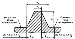 9.6 Вычисление ширины верхнего основания трапецеидального выступа Ширину верхнего основания выступа bи, нм, вычисляют по формуле bи = тВи, (4) где т - масштабный коэффициент видеоизображения для оси абсцисс, вычисленный по 9.2, нм/пиксель; Ви - вспомогательная величина, вычисленная по 9.5, пиксель. 9.7 Вычисление ширины нижнего основания трапецеидального выступа Ширину нижнего основания трапецеидального выступа bр, нм, вычисляют по формуле bр = bи + 1,4142h, (5) где bи - ширина верхнего основания поверяемого выступа, вычисленная по 9.6, нм; h - высота поверяемого выступа, вычисленная по 9.4, нм. 9.8 Вычисление проекции наклонной стенки на плоскость нижнего основания выступа Проекцию наклонной стенки на плоскость нижнего основания выступа а, нм, вычисляют по формуле а = 0,7071h, (6) где h - высота выступа, вычисленная по 9.4, нм. Абсолютные погрешности измерений значений bи, bр, h и а поверяемого элемента рельефной меры не превышают 0,8 нм при условии использования средств поверки, обеспечивающих погрешности измерений не хуже указанных в 4.1. 10 Оформление результатов поверки10.1 Результаты поверки оформляют в виде свидетельства установленной формы и внесением соответствующей записи в паспорт (формуляр) рельефной меры. 10.2 На лицевой стороне свидетельства о поверке наносят знак поверки (поверительное клеймо), а также указывают даты выдачи и окончания срока действия свидетельства. На оборотной стороне свидетельства о поверке и в паспорте (формуляре) рельефной меры должны быть приведены значения высоты выступа, ширины верхнего и нижнего его оснований, а также значение проекции наклонной стенки на плоскость нижнего основания выступа поверяемого элемента. Для перечисленных метрологических характеристик рельефной меры необходимо также указать абсолютные погрешности их измерений, приведенные в подразделе 9.9 настоящего стандарта. Приложение