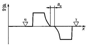 где l2 - длина волны излучения гелий-неонового лазера в вакууме, приведенная в паспорте (формуляре) на вертикальный лазерный интерферометр, нм; DФв - фазовый сдвиг, измеренный по 8.3.4, рад; п - показатель преломления воздуха при фактических значениях температуры окружающей среды, влажности воздуха и атмосферного давления, вычисленный по приложению А. 9.4 Вычисление высоты выступа поверяемого элемента рельефа Значение высоты выступа л в нанометрах равно значению вертикального перемещения Z-сканера DН, вычисленному по 9.3. 9.5 Вычисление вспомогательной величины для определения ширины верхнего основания выступа поверяемого элемента рельефа При определении ширины верхнего основания трапецеидального выступа bи используют вспомогательную величину, для вычисления которой: - вычисляют производную по горизонтальной координате. Для видеопрофиля, изображенного на рисунке 2, результат такого вычисления приведен на рисунке 3; - проводят анализ результатов вычисления производной видеопрофиля по координате и вычисляют значение вспомогательной величины Bи в пикселях, которая равна разности соответствующих абсцисс точек, как показано на рисунке 3.