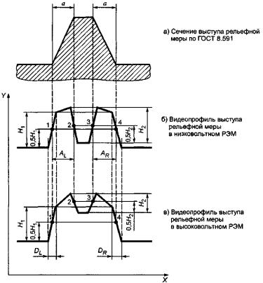 в пикселях; Y - ось значений величины информативного сигнала в пикселях 8.2.5 После завершения операции настройки по 8.2.4 определяют значение в пикселях общей длины видеопрофиля в направлении сканирования. Это значение общей длины видеопрофиля, а также установленное при этом значение электронно-оптического увеличения РЭМ указывают в протоколе поверки. 8.2.6 Проверяют установку рельефной меры на рабочем столе РЭМ в соответствии с инструкцией по его эксплуатации. При этом проверяют: - параллельность вертикальной оси изображения относительно перпендикуляра к поверхности рельефной меры. Для обеспечения параллельности поворачивают рельефную меру вокруг оси, перпендикулярной к плоскости ее поверхности, или осуществляют электронное вращение растра РЭМ, если такая возможность предусмотрена конструкцией РЭМ; - параллельность плоскости рельефной меры относительно направления строчной развертки РЭМ, что подтверждается равенством отрезков DL и DR на видеопрофилях, приведенных на рисунке 1 б) и в). Примечание - Процедура проверки установки рельефной меры на рабочем столе РЭМ зависит от его конструкции и используемого типа катода для получения электронного зонда. В качестве операций, которые проводят при такой проверке, могут быть настройка соответствующего значения тока зонда, компенсация астигматизма, настройка тока объективной линзы, юстировка объективной диафрагмы и др. Поэтому для каждого конструктивного исполнения РЭМ целесообразно разработать методику проверки установки рельефной меры, определяющую последовательность операций и визуальные критерии оптимальной фокусировки электронного зонда. 8.2.7 Если после проверки по 8.2.6 не получены положительные результаты, то рельефную меру перемещают на рабочем столе РЭМ по линии элемента рельефа на расстояние, соответствующее размеру изображения. После этого операции по 8.2.3-8.2.6 повторяют. Примечание - Необходимость перемещения объекта характерна для РЭМ с паромасляной системой откачки, в которых за время выполнения операций по 8.2.4 может произойти нарастание слоя загрязнений, искажающего размеры элементов рельефной меры. В высоковакуумных РЭМ и РЭМ с безмасляной откачкой этот эффект значительно слабее. Необходимость перемещения устанавливают экспериментально на этапе подготовки к поверке. При оформлении результатов поверки делают запись о выполнении операций по 8.2.6 и 8.2.7. 8.3 Определение метрологических характеристик 8 соответствии с инструкцией по эксплуатации РЭМ выполняют сканирование исследуемого элемента рельефной меры. Видеопрофиль выступа рельефной меры представлен на рисунке 1 б) и в). 8.4 Оформление протокола поверки Результаты измерений параметров рельефной меры, приведенных на рисунке 1 б) и в), оформляют в виде протокола. В протокол также записывают значения общей длины видеопрофиля и электронно-оптического увеличения РЭМ, определенных по 8.2.5. Форма протокола - произвольная. Протокол с результатами измерений должен храниться как минимум до следующей поверки РЭМ. 9 Обработка результатов измерений9.1 Вычисление координат контрольных точек на видеопрофиле информативного сигнала микроскопа Для поверки РЭМ используют расстояние в направлении сканирования в пикселях между контрольными точками, которое не зависит от эффективного диаметра электронного зонда при 