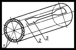 1 - сектор; 2 - полоса; 3 - испытуемый образец Рисунок 1 - Изготовление образцов 5.2.2 Способы изготовления образцов 5.2.2.1 Способы Образцы изготовляют из центра полосы, вырезанной из отрезка трубы, вырубкой штампом-просечкой или механической обработкой способом, изложенным в стандарте или техническом документе на изделие. 5.2.2.2 Вырубка штампом-просечкой Образец вырубают из полосы штампом-просечкой (4.6) с ровными режущими поверхностями без зазубрин соответствующего профиля по ГОСТ Р 53652.2 или ГОСТ Р 53652.3. 5.2.2.3 Механическая обработка Образец изготовляют фрезерованием, используя, при необходимости, шаблон. Форму фрезы и режим механической обработки (скорость вращения и подачи) выбирают таким образом, чтобы избежать нагревания образца и повреждения его поверхности в виде трещин, царапин, сколов и других видимых дефектов. Механическую обработку проводят с учетом ГОСТ 26277. 5.2.2.4 Контрольные метки Контрольные метки, ограничивающие расчетную длину l0, должны быть расположены на равном расстоянии от центра образца, а расстояние между ними измеряют с погрешностью не более 1 %. Контрольные метки не допускается наносить на образец царапанием, перфорированием, тиснением или другим способом, повреждающим испытуемый материал. Применяемая маркировочная жидкость также не должна оказывать разрушающего воздействия на испытуемый материал, а параллельные линии должны быть настолько тонкими, насколько это возможно. 5.2.2.5 Испытание проводят на образцах в количестве, указанном в таблице 1, в зависимости от номинального наружного диаметра, если не установлено иное в стандарте или техническом документе на изделие. 6 Кондиционирование6.1 Перед испытанием образцы кондиционируют в воздушной камере (помещении) или в ванне с водой при температуре (23 ±2)°С в течение времени, указанного в таблице 2 ГОСТ 24157, в зависимости от толщины стенки образца. Образцы испытывают не ранее чем через 15 ч после изготовления труб, если не установлено иное в стандарте или техническом документе на изделие.