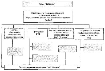 Рисунок 1 - Организационная структура системы ВТД трубопроводов технологического газа КС и ДКС Организационная структура включает структурные подразделения ОАО "Газпром", в том числе Управление по транспортировке газа и газового конденсата Департамента по транспортировке, подземному хранению и использованию газа и Управление по добыче газа и газового конденсата (нефти) Департамента по добыче газа, газового конденсата, нефти, Эксплуатирующие организации, ООО "Газнадзор", ДОАО "Оргэнергогаз", Специализированные организации, научно-исследовательский институт ООО "ВНИИГАЗ". 6.2 В задачу структурных подразделений ОАО "Газпром" входит: - формирование стратегии обеспечения эксплуатационной надежности трубопроводов технологического газа КС и ДКС; - организационно-техническое обеспечение системы технического диагностирования трубопроводов технологического газа КС и ДКС; - прием и анализ заявок на проведение ВТД и составление годового плана работ по ВТД; - анализ и обобщение информации по результатам ВТД; - контроль за выполнением плана работ по ВТД; - организация системы подготовки кадров. 6.3 В задачу ООО "ВНИИГАЗ" входит: - научное обеспечение технического диагностирования; - разработка нормативной документации ОАО "Газпром" по обеспечению эксплуатационной надежности трубопроводов технологического газа КС и ДКС. 6.4 В задачу ДОАО "Оргэнергогаз" входит: - подготовка нормативно-технической базы для проведения ВТД; - проведение технического диагностирования внутритрубными средствами контроля; - разработка и ведение централизованной системы сбора, передачи, обработки и хранения данных о технологических объектах добычи, транспорта и подземного хранения газа ЕСГ (ССД "Инфотех"); - анализ результатов технического диагностирования, методическое и техническое обеспечение процесса подготовки и аттестации кадров в области ВТД. 6.5 В задачу Специализированных организаций входит: - проведение технического диагностирования внутритрубными средствами контроля; - выдача заключений о техническом состоянии трубопроводов технологического газа КС и ДКС, а также рекомендаций об условиях дальнейшей эксплуатации объектов технического диагностирования. 6.6 В задачу Эксплуатирующих организаций входит: - формирование заявок на проведение ВТД трубопроводов технологического газа КС и ДКС, подготовка трубопроводов технологического газа КС и ДКС к техническому диагностированию; - обеспечение безопасного проведения работ по ВТД, оперативный контроль за выполнением работ по ВТД; - проведение ремонтно-восстановительных работ, сбор и передача информации о результатах ремонта и др. в ССД "Инфотех" (ДОАО "Оргэнергогаз"). 6.7 Контроль качества работ по ВТД трубопроводов технологического газа КС и ДКС в соответствии с СТО Газпром 2-3.5-032 осуществляет ООО "Газнадзор". 7 Планирование и порядок проведения работ по техническому диагностированию трубопроводов технологического газа компрессорных станций и дожимных компрессорных станций7.1 Эксплуатирующие организации совместно с Управлением по транспортировке газа и газового конденсата Департамента по транспортировке, подземному хранению и использованию газа ОАО "Газпром" при необходимости планируют объемы работ по ВТД и учитывают затраты на эти работы в расчете себестоимости транспорта газа, представля