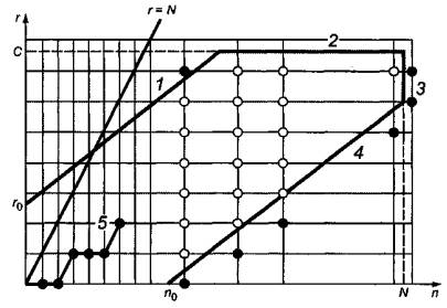 1; 2 - границы браковки; 3; 4 - границы приемки; 5 - линия реализации процесса отказов. Примечание - Линия реализации процесса отказов не может попадать в область, расположенную на рисунке выше границы r = N. Рисунок 1 9.5 Испытания продолжают до тех пор, пока линия реализации процесса отказов впервые пересечет границу приемки или браковки плана испытаний. В зависимости от того, какую из границ плана испытаний пересекла линия реализации процесса отказов, испытания завершают и принимают соответствующее решение. Приложение А