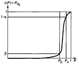 При браковочном Рβ и приемочном Рα значениях ВБР сумма вероятностей достижения границы приемки равна соответственно значению риска потребителя β и дополнению до единицы риска поставщика α.