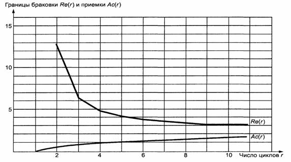 Рисунок 2 - Пример плана испытаний Таблица 4 - Границы областей приемки Ас(r) и браковки Re(r) для последовательного плана испытаний